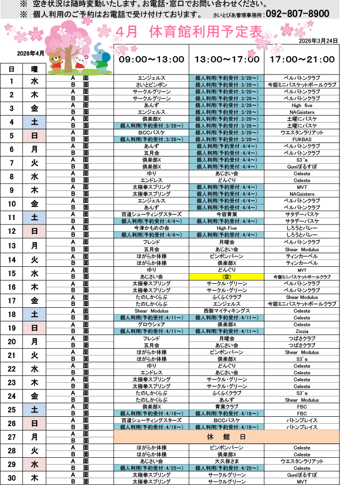 予約受付方法:毎週土曜日に次の週の個人利用枠を受付ます。