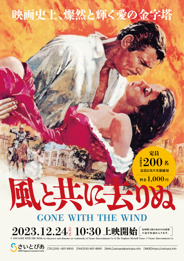 今回は、地域からのリクエストが最も多かった名作「風と共に去りぬ」の上映を行います。長編ものの作品となっておりますので、途中休憩を入れながら上映いたします。長編となりますので、クッションなどを持参していただくとより一層楽しむことができると思います。